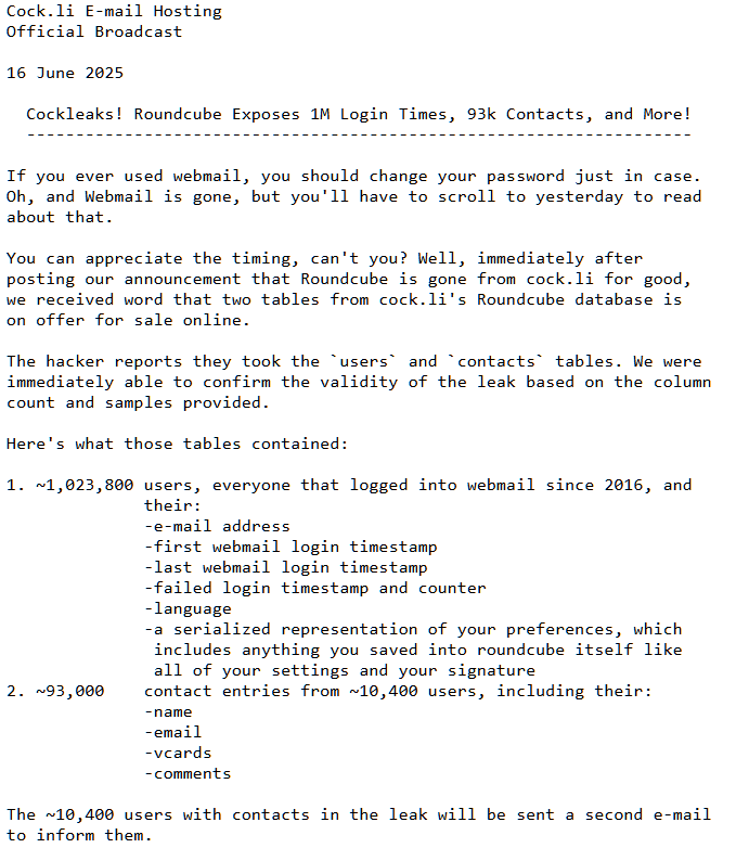 В Cock.li полагают, что данные были украдены с помощью старой уязвимости SQL-инъекций в Roundcube Webmail (CVE-2021-44026). При этом незадолго до взлома сервис изучал более свежую RCE-уязвимость в Roundcube (CVE-2025-49113), которая уже применяется в атаках. По результатам этого анализа, в июне 2025 года Roundcube был полностью удален с платформы.