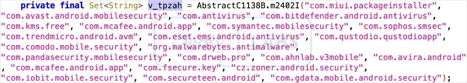 Чтобы избежать обнаружения, Klopatra содержит жестко закодированный список имен пакетов популярных антивирусов для Android и пытается удалить их.