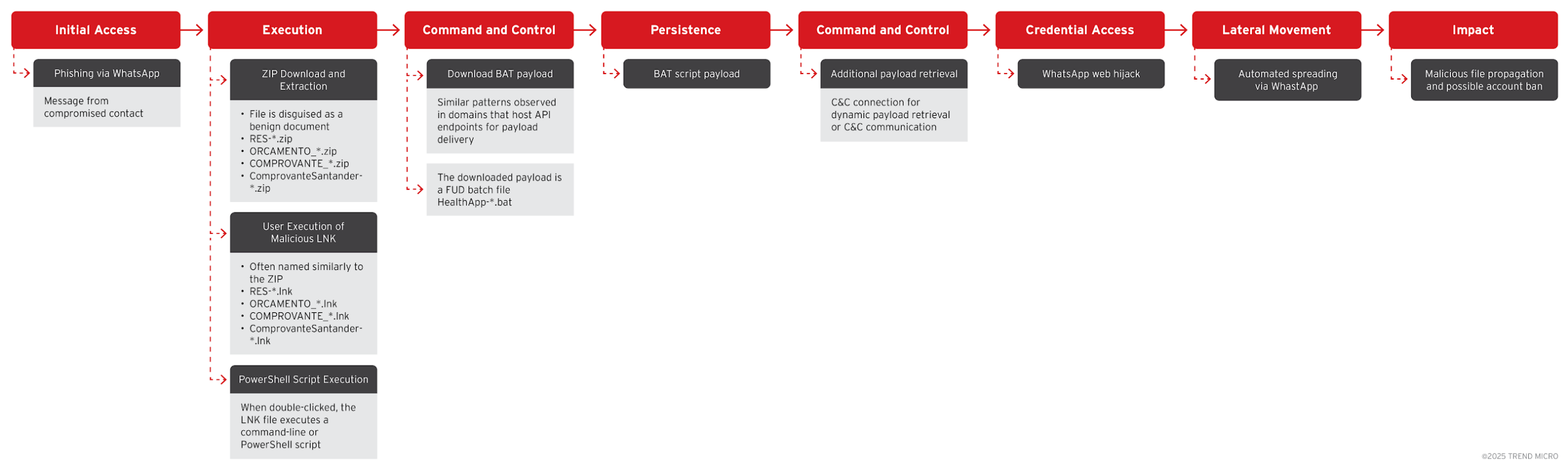 После открытия вредоносного вложения малварь автоматически распространяется через WhatsApp Web на ПК: зараженный аккаунт рассылает файлы ZIP всем контактам и группам, что ведет к массовому спаму и часто заканчивается блокировкой аккаунта жертвы за нарушение правил мессенджера.