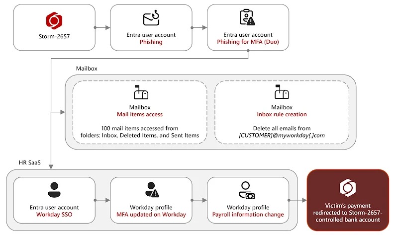 Так, в одной из кампаний, которую Microsoft наблюдала в первой половине 2025 года, атакующие получили первоначальный доступ через фишинговые письма, собирающие учетные данные и МФА-коды через фишинговую ссылку. В итоге злоумышленники проникли в аккаунты Exchange Online и захватили профили жертв в Workday через single sign-on (SSO).