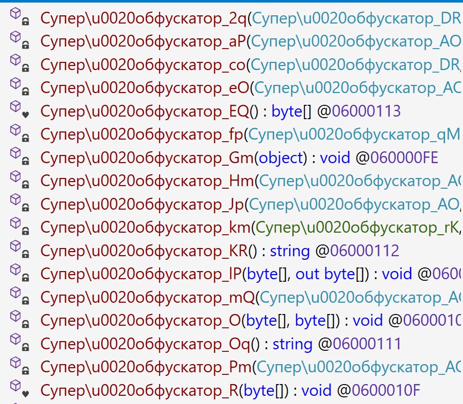 Так, в наблюдаемых образцах имена функций были заменены строками, содержащими кириллические символы, которые, по всей видимости, были введены злоумышленниками намеренно.