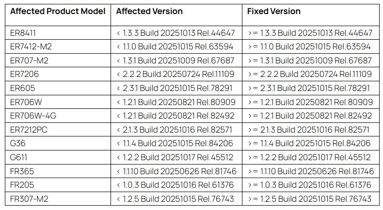 Уязвимости затрагивают 13 моделей шлюзов Omada, включая ER8411, ER7412-M2, ER707-M2, ER7206, ER605, ER706W, ER706W-4G, ER7212PC, G36, G611, FR365, FR205 и FR307-M2 с различными версиями прошивок.
