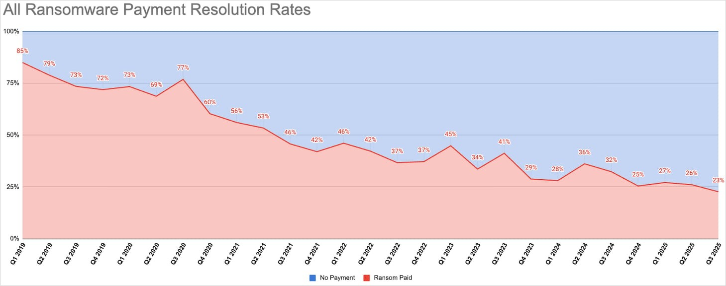 Доля компаний, которые соглашаются заплатить выкуп после атак вымогателей, опустилась до исторического минимума — лишь 23% жертв соглашались на условия злоумышленников в третьем квартале 2025 года, сообщают аналитики Coveware.