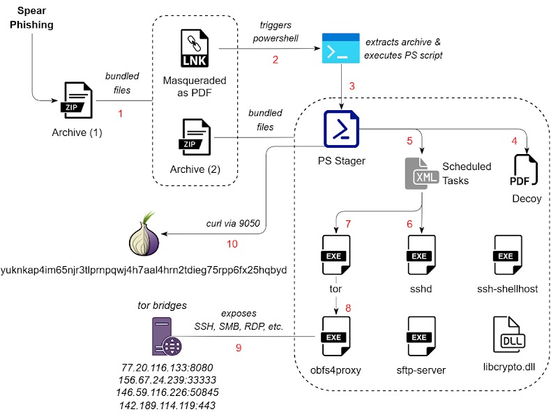Атаки начинаются с фишинговых писем, содержащих документы-приманки, связанные с военной тематикой. Получателей писем побуждают открыть ZIP-архив, внутри которого находится скрытая папка со вторым архивом и Windows-ярлыком (LNK). Открытие ярлыка запускает многоэтапную цепочку заражения.