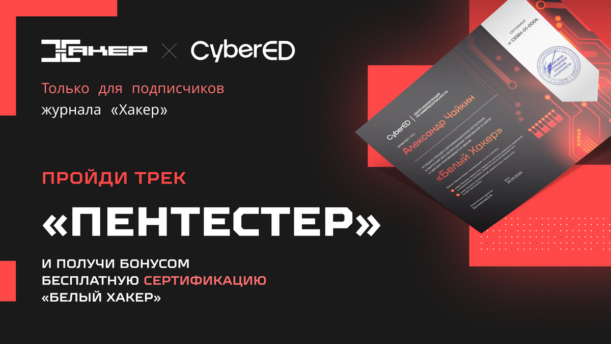 CyberEd открывает набор в программу «Пентестер», и для аудитории «Хакера» действует специальное предложение — бесплатная сертификация CyberEd White Hacker (обычная цена сертификата составляет 33 000 ₽).