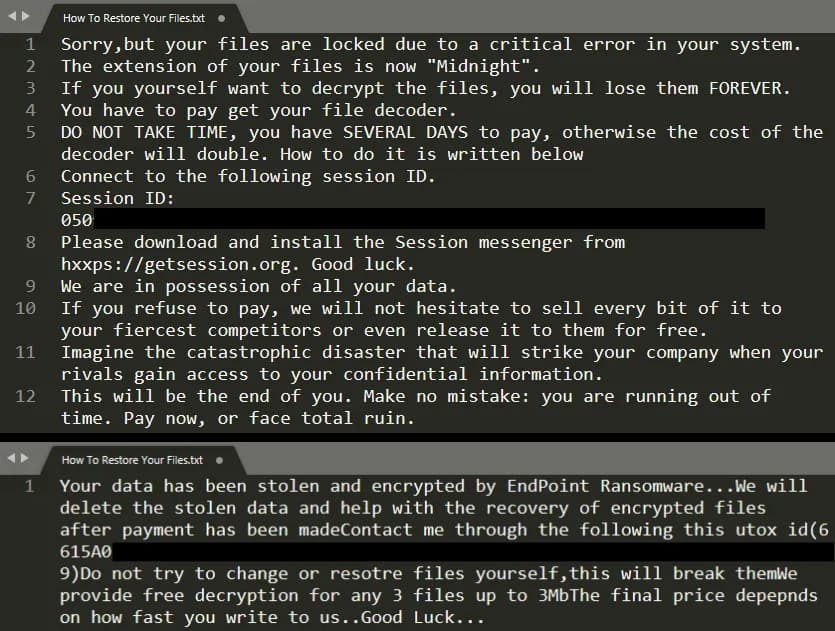 На зараженных устройствах в итоге появляются файлы с расширениями .midnight или .endpoint, а иногда эта метка вшивается прямо в содержимое файла. Жертве оставляют стандартную записку с требованием выкупа (How To Restore Your Files.txt), а порой даже лог вроде report.midnight или debug.endpoint, по которому видно, как работал скрипт.