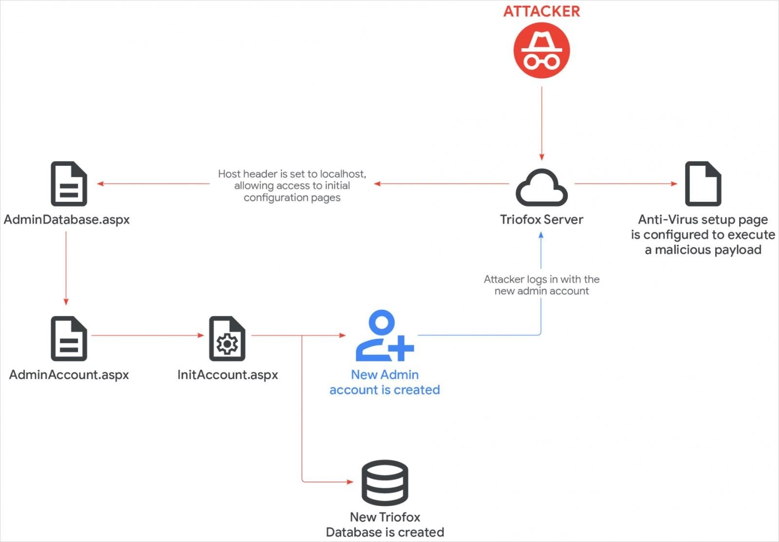 В рамках этой атаки злоумышленники эксплуатировали встроенный антивирус Triofox. Так, отправив GET-запрос с localhost в HTTP Referer, хакеры получили доступ к странице конфигурации AdminDatabase.aspx, которая запускается для настройки Triofox после установки. После этого атакующие создали новую учетную запись администратора Cluster Admin, а затем загрузили вредоносный скрипт.