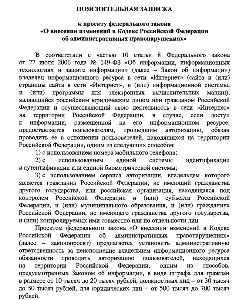 В Госдуму внесли законопроект, который предусматривает административную ответственность и штрафы в размере до 700 000 рублей для владельцев российских сайтов, которые игнорируют требования об авторизации пользователей только через российские сервисы.