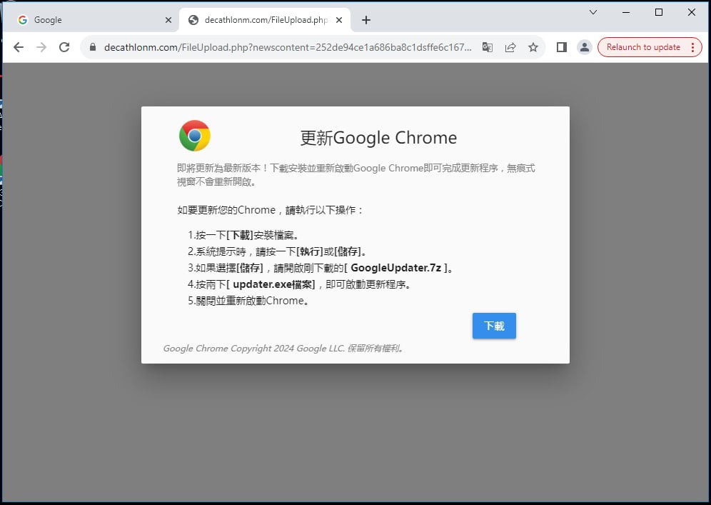 С ноября 2022 по сентябрь 2025 года APT24 скомпрометировала более 20 легитимных сайтов в разных доменах, внедрив в их код вредоносный JavaScript. Скрипт осуществлял фингерпринтинг посетителей (только для Windows-систем) и показывал жертвам фальшивое всплывающее окно, сообщающее о необходимости обновления ПО (на самом деле окно приводило к загрузке малвари BadAudio).