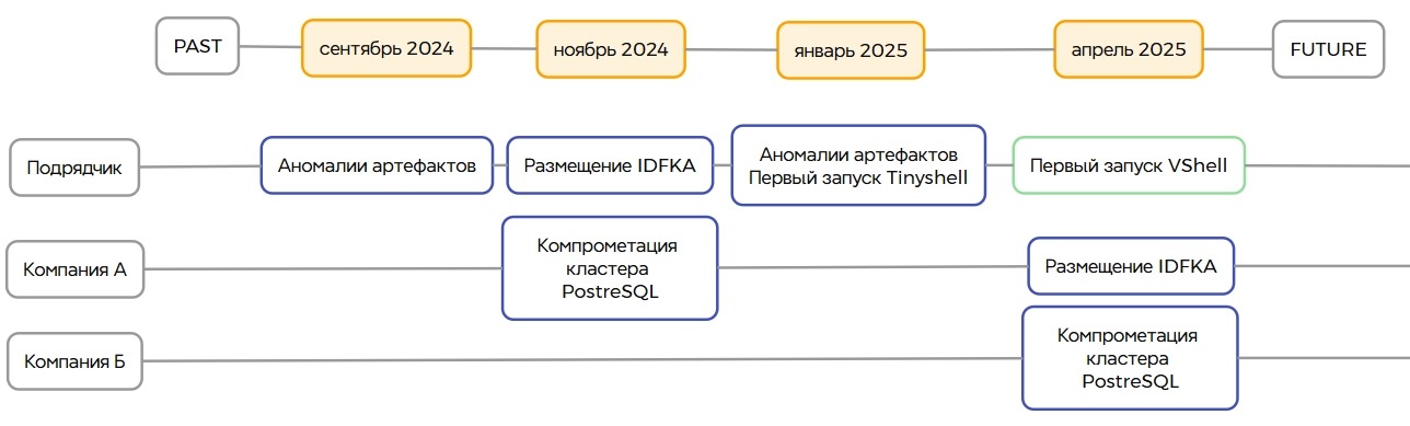 Самый ранний образец IDFKA был размещен в инфраструктуре вышеупомянутого подрядчика в ноябре 2024 года, но анализ артефактов показал, что компрометация началась еще в сентябре 2024 года. Хакеры тщательно скрывали следы своей активности: удаляли записи из системных журналов, модифицировали файлы wtmp и lastlog, а также подменяли артефакты вручную. Благодаря высокой скрытности IDFKA хакеры находились в инфраструктуре подрядчика не менее 10 месяцев.