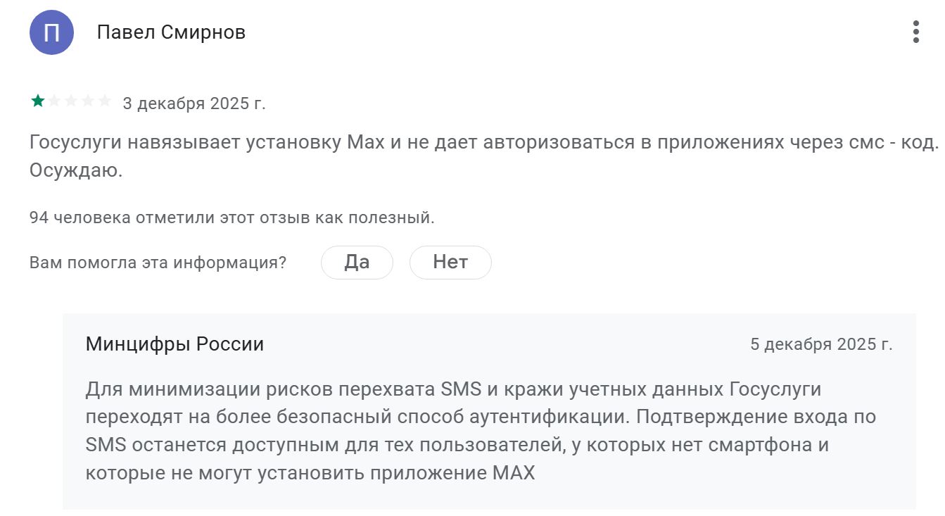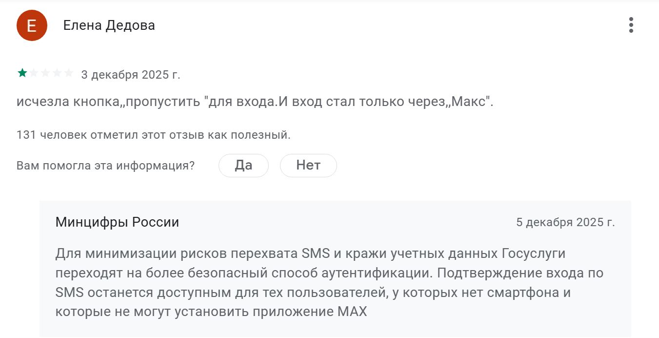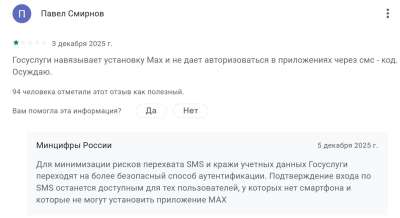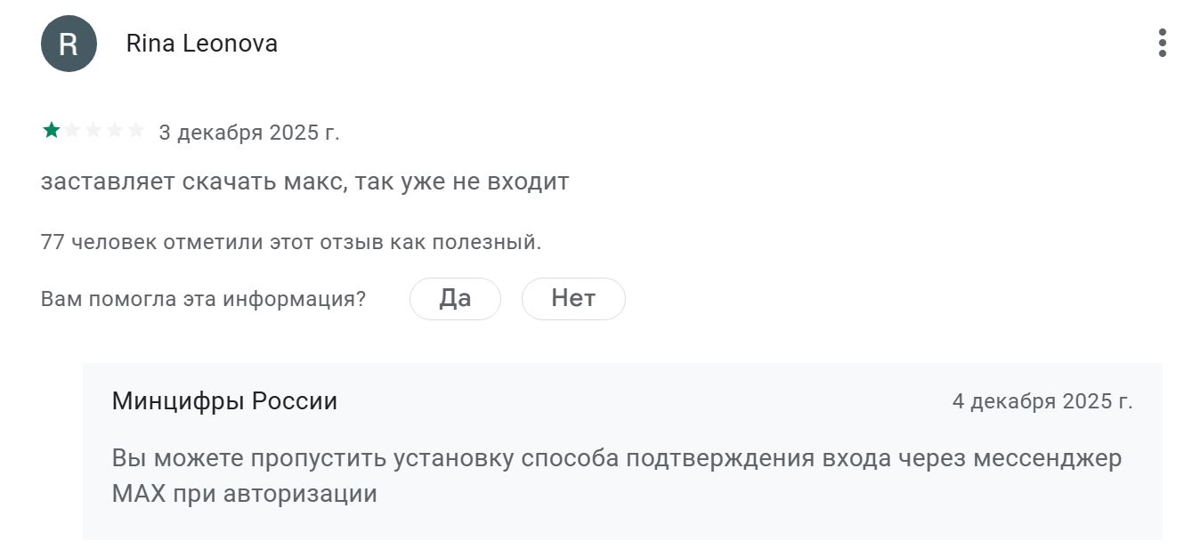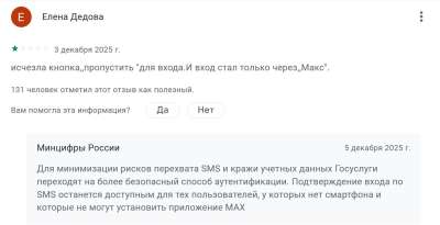 Судя по отзывам в официальном магазине Google Play, на этой неделе пользователи столкнулись с тем, что приложение «Госуслуги» требует подтверждения входа через мессенджер Max. Ранее от этого приложения можно было отказаться с помощью кнопки «Пропустить», однако теперь кнопку убрали.