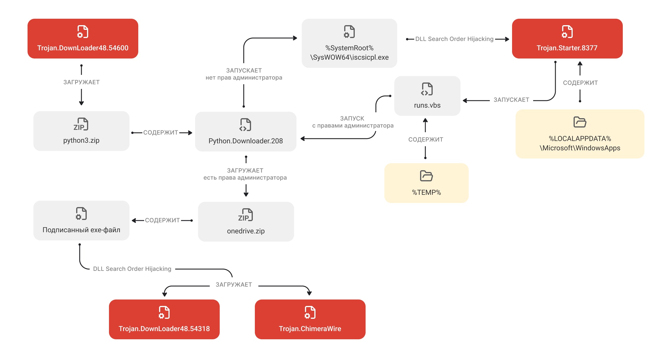 На компьютеры жертв ChimeraWire попадает через цепочку загрузчиков, которые эксплуатируют уязвимости типа DLL Search Order Hijacking и применяют антиотладочные трюки, чтобы не привлекать внимания. Исследователи отследили минимум две схемы заражения: в одной из них центральное место занимает вредоносный скрипт Python.Downloader.208, а в другой — малварь Trojan.DownLoader48.61444, которая по принципу работы схожа с Python.Downloader.208 и фактически является его альтернативой.