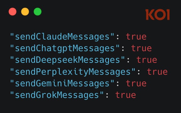 Механизм сбора данных реализован через специальные JavaScript-файлы, которые запускаются при посещении любого из целевых ИИ (будь то ChatGPT, Claude, Gemini и так далее). Для каждого чат-бота создан отдельный скрипт: chatgpt.js, claude.js, gemini.js.