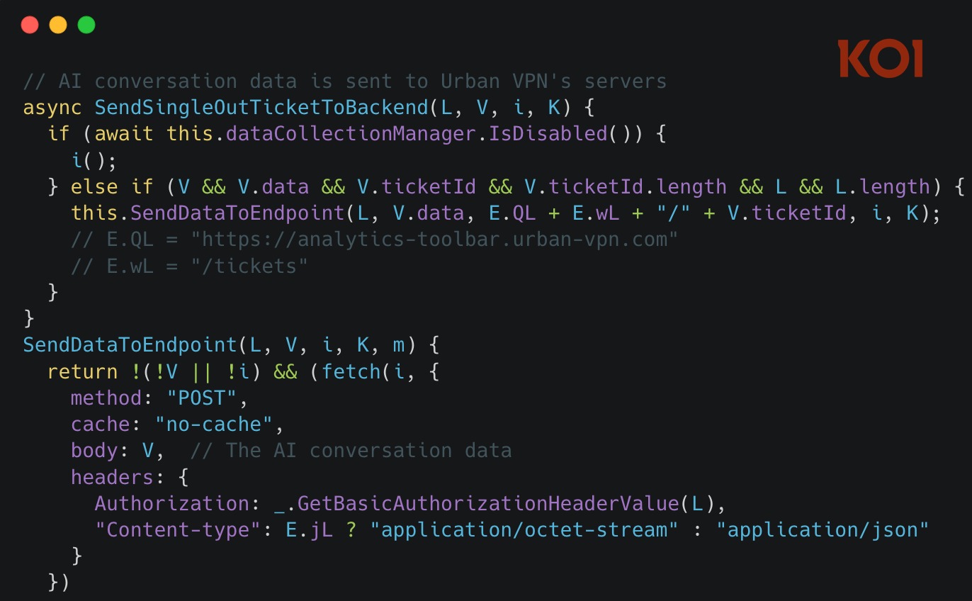 В итоге расширение собирает полный набор информации: промпты пользователей, ответы чат-ботов, идентификаторы сессий, временные метки, метаданные сессий, данные о платформе и используемой модели ИИ. Вся собранная информация передается на два удаленных сервера: analytics.urban-vpn[.]com и stats.urban-vpn[.]com.