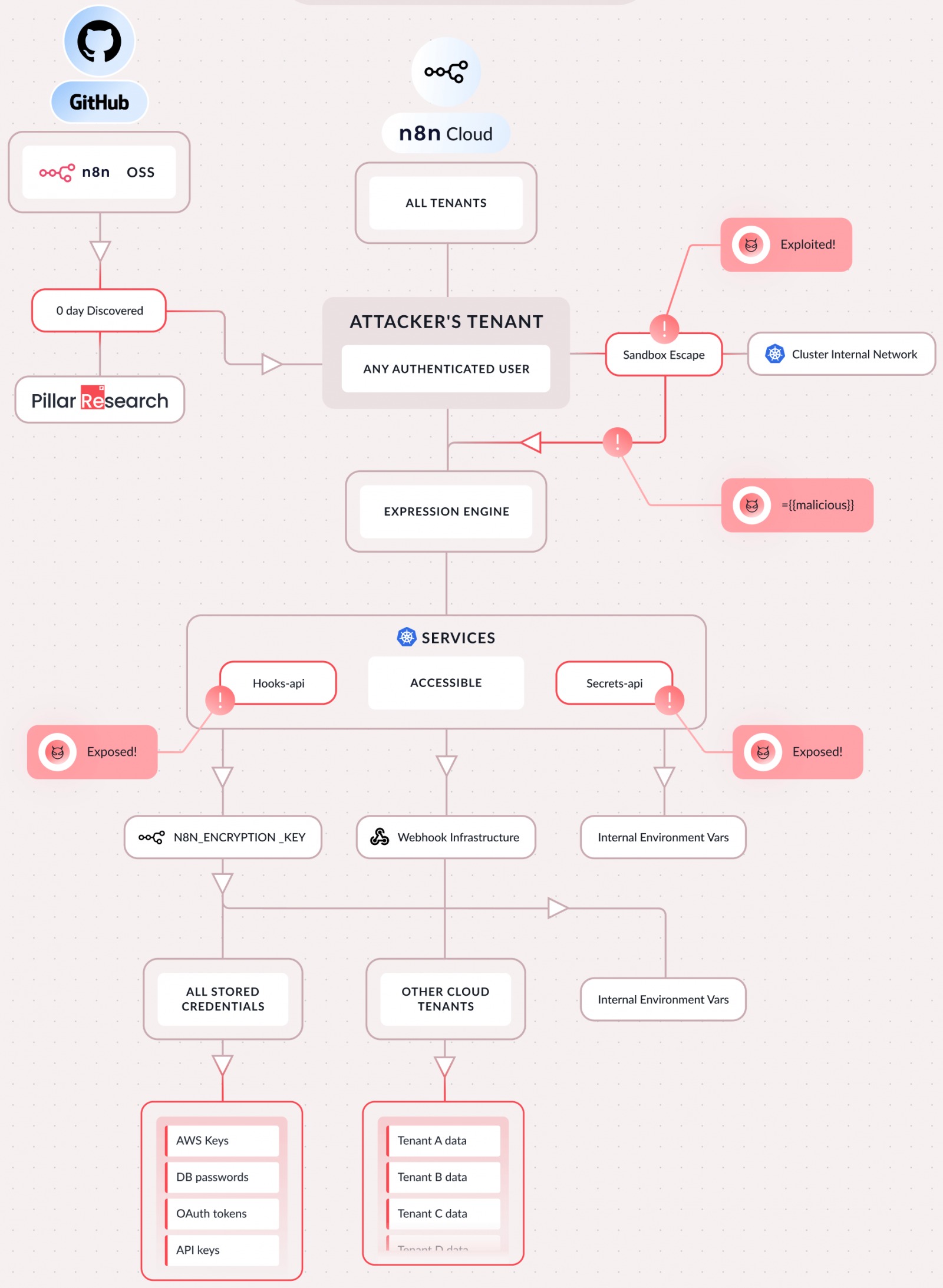 Проблема позволяла атакующим получить полный контроль над инстансом n8n: выполнять системные команды, похищать сохраненные учетные данные (API-ключи, OAuth-токены), получать доступ к файловой системе и внутренним сервисам, перехватывать ИИ-воркфлоу (перехватывать промпты, модифицировать ответы, перенаправлять трафик). Более того, так как n8n работает в мультитенантной среде, доступ к внутренним сервисам кластера потенциально открывает путь к данным других арендаторов.
