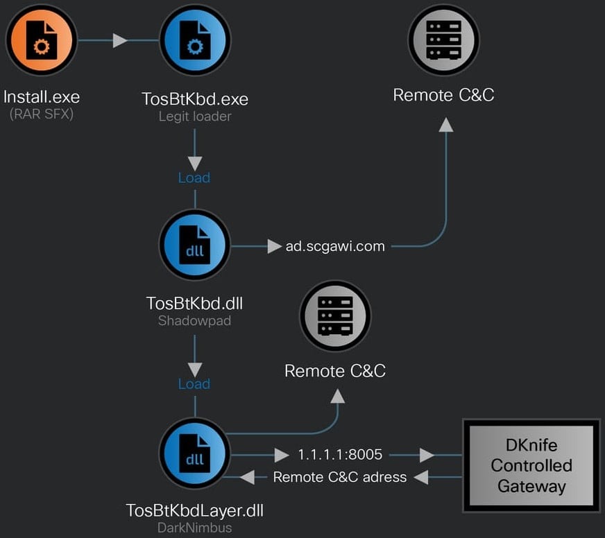 Также отмечается, что вредонос используется для доставки и взаимодействия с бэкдорами ShadowPad и DarkNimbus (он же DarkNights) — оба ранее уже связывали с китайскими хакерами. Так, исследователи зафиксировали, как DKnife устанавливал ShadowPad для Windows, подписанный сертификатом китайской компании, а следом разворачивал DarkNimbus. На Android-устройства бэкдор доставлялся напрямую.