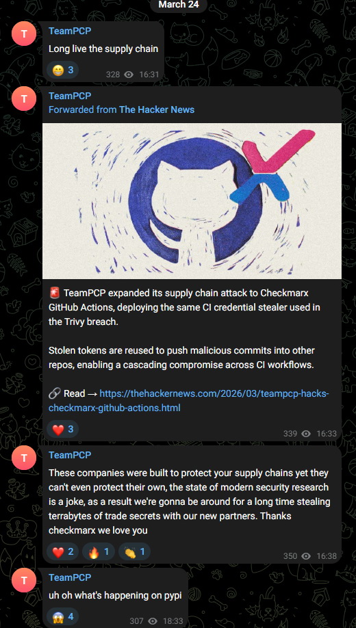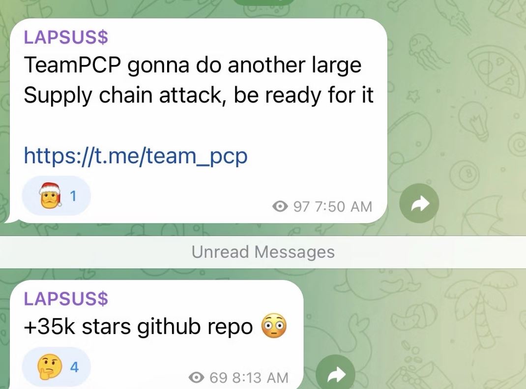 Еще одним важным поворотом в этой истории стало предполагаемое партнерство TeamPCP с группировкой Lapsus$. Как сообщают аналитики компании Socket, хакеры открыто хвастаются своими атаками в Telegram и заявляют о планах «похищать терабайты коммерческих секретов вместе с новыми партнерами». Хотя эти партнеры не названы напрямую, практически одновременно с этим в Telegram-канале Lapsus$ появились посты о предстоящей атаке на цепочку поставок, связанной с TeamPCP.