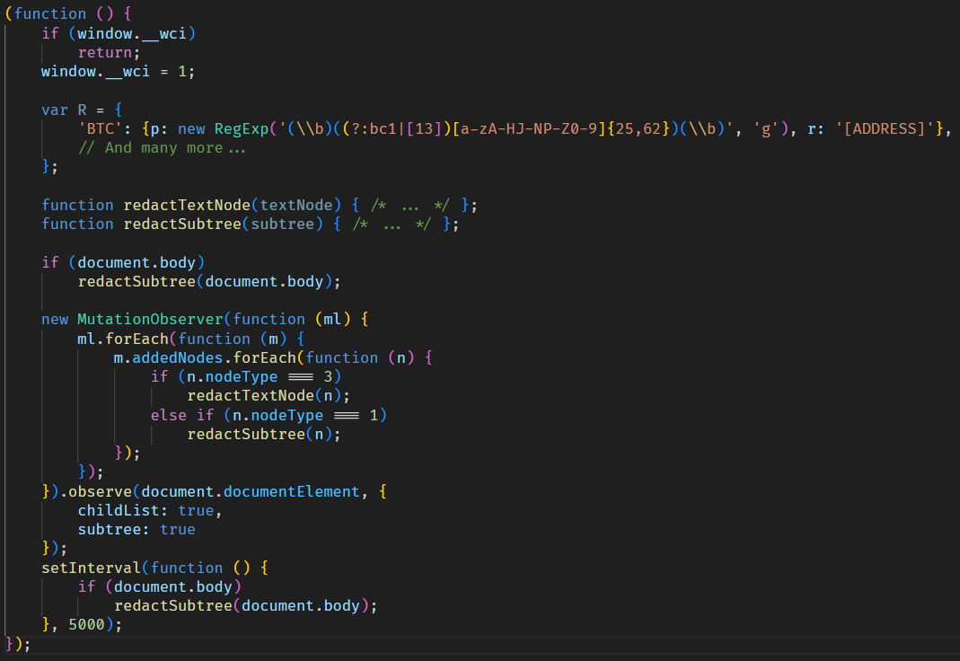 Кейлоггер перехватывает и передает все нажатия клавиш на управляющий сервер в режиме реального времени через WebSocket. Клиппер, в свою очередь, внедряется в Chrome или Edge как вредоносное расширение и с помощью регулярных выражений подменяет адреса криптовалютных кошельков (Bitcoin, Litecoin, Monero, Doge и других) на адреса злоумышленников.