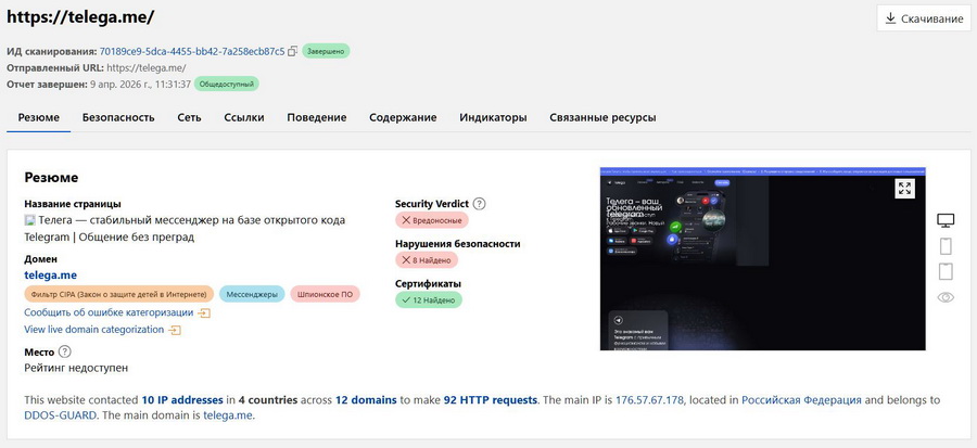 11 апреля представители Telega сообщили в своем Telegram-канале, что компания Cloudflare сняла « классификацию, которую ранее ошибочно присвоила доменам Телеги».