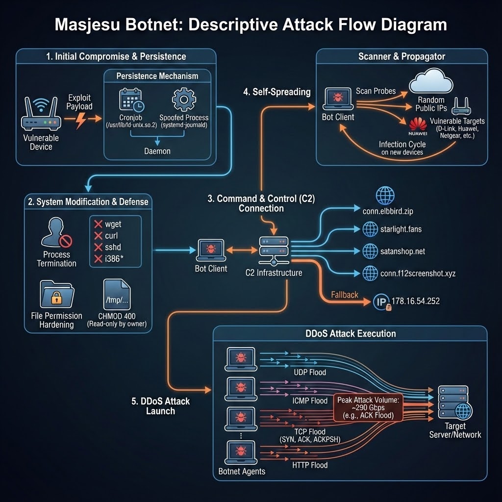 Masjesu также известен под именем XorBot — за использование XOR-шифрования для сокрытия строк, конфигураций и полезных нагрузок. Впервые этот ботнет задокументировали китайские специалисты NSFOCUS в декабре 2023 года, связав его с оператором под ником synmaestro.
