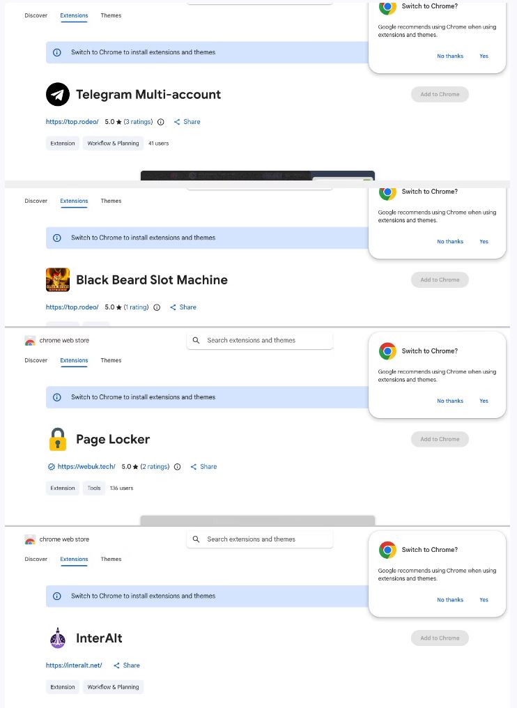 Расширения были опубликованы от имени пяти разных аккаунтов: Yana Project, GameGen, SideGames, Rodeo Games и InterAlt. Чтобы не вызывать подозрений, они маскировались под клиенты Telegram, игровые автоматы и Keno, утилиты для улучшения работы YouTube и TikTok, переводчики и инструменты для работы с вкладками. Хотя функциональность у расширений разная, бэкенд у всех был один — сервер на VPS-хостинге Contabo по адресу 144.126.135[.]238.